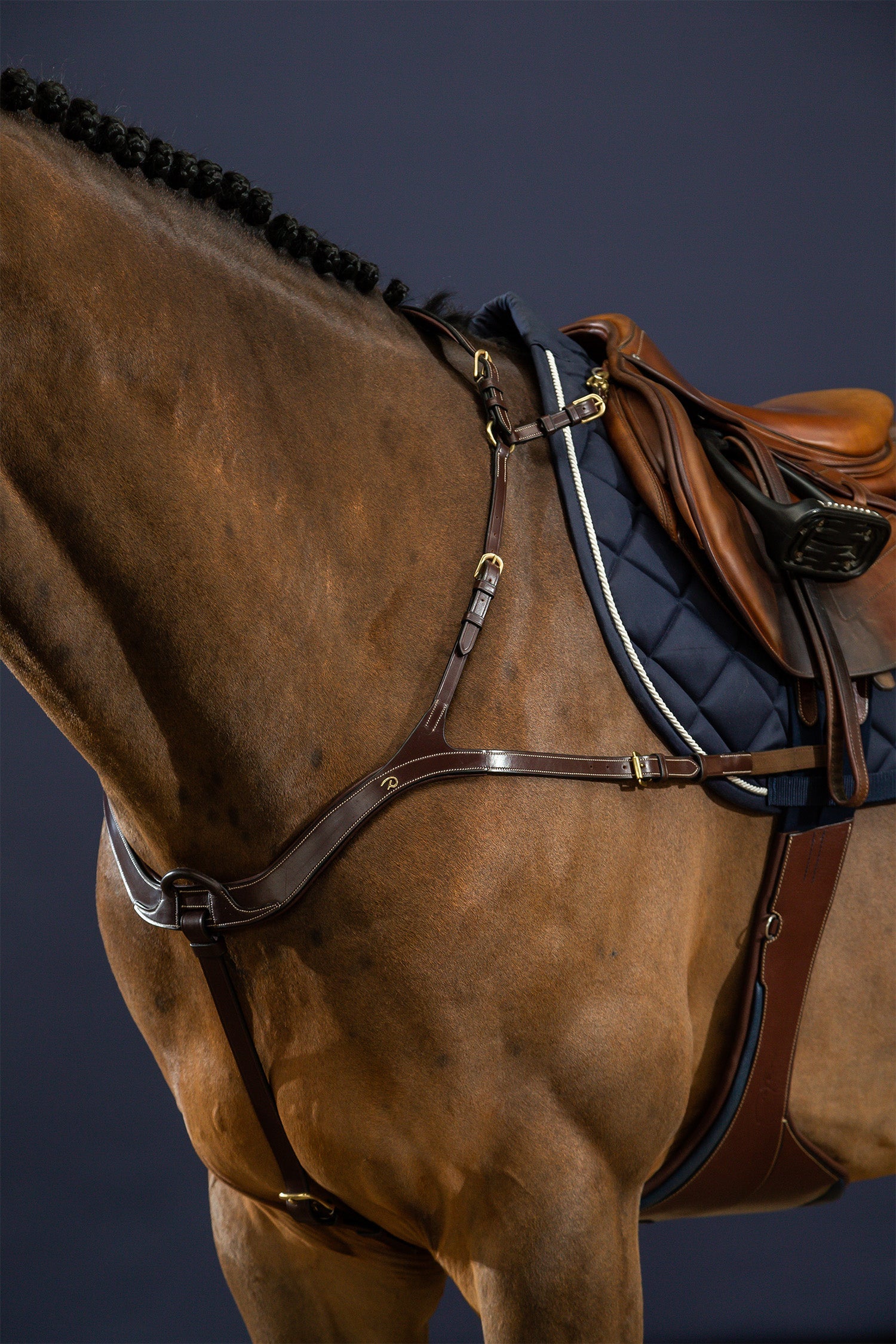 Anatomisk brösta 5-punkts, Dyón Collection från Dyón. Mycket trevlig 5-punkts-brösta med perfekt passform. Tillverkat i fint spanskt läder med mässingsspännen och vit mönstersöm. Anatomiskt formad för att ge hästen obegränsad rörlighet.