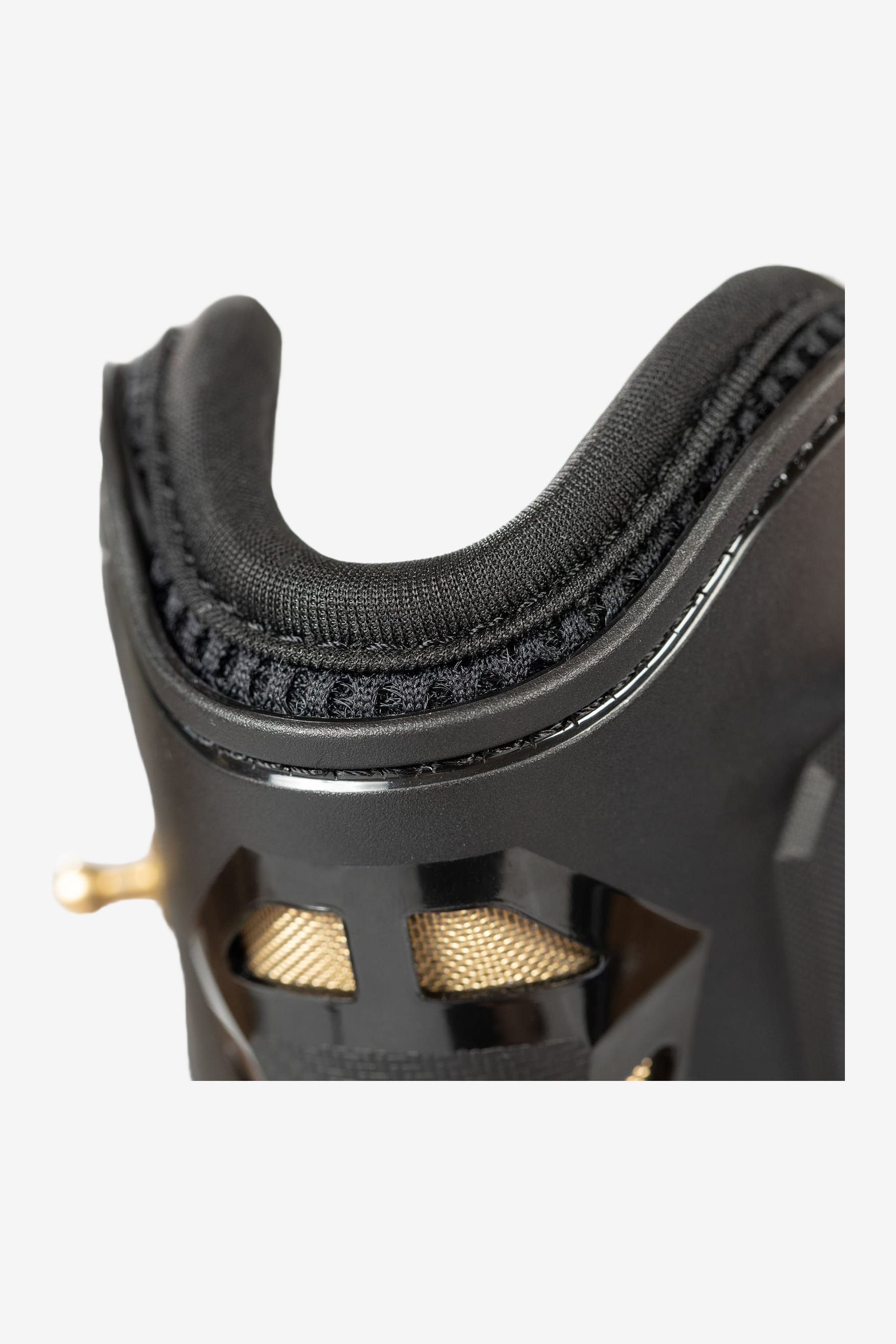 Skyddens utsida består av ett hållbart skal, med ett stötabsorberande material på baksidan av senan som reducerar och sprider effekten av hårda islag och stötar. För extra ventilation finns lufthål längs senan och på sidorna.