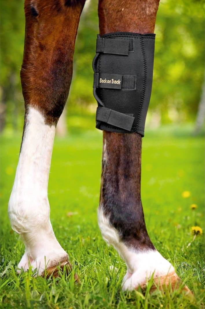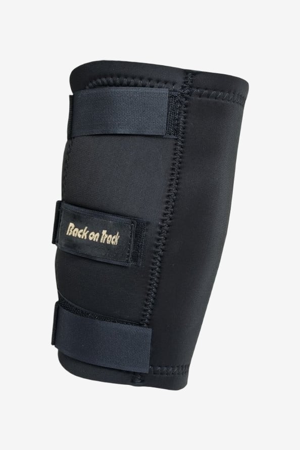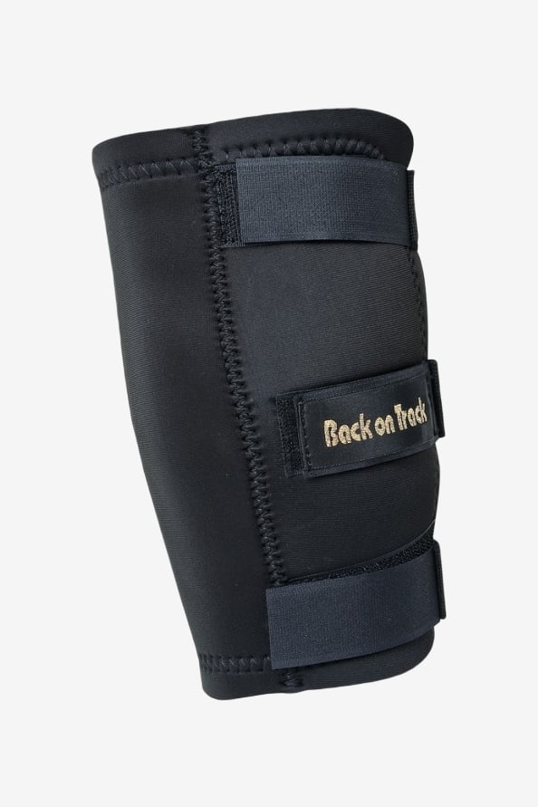 Knäskydden används vid olika besvär i carpus och vävnaderna runt leden. Knäskydden har tre kardborrespännen och finns för höger eller vänster ben. Lämpliga för användning under vila i stallet eller vid transport. Denna produkt rekommenderas inte att användas under ridning eller i hage.