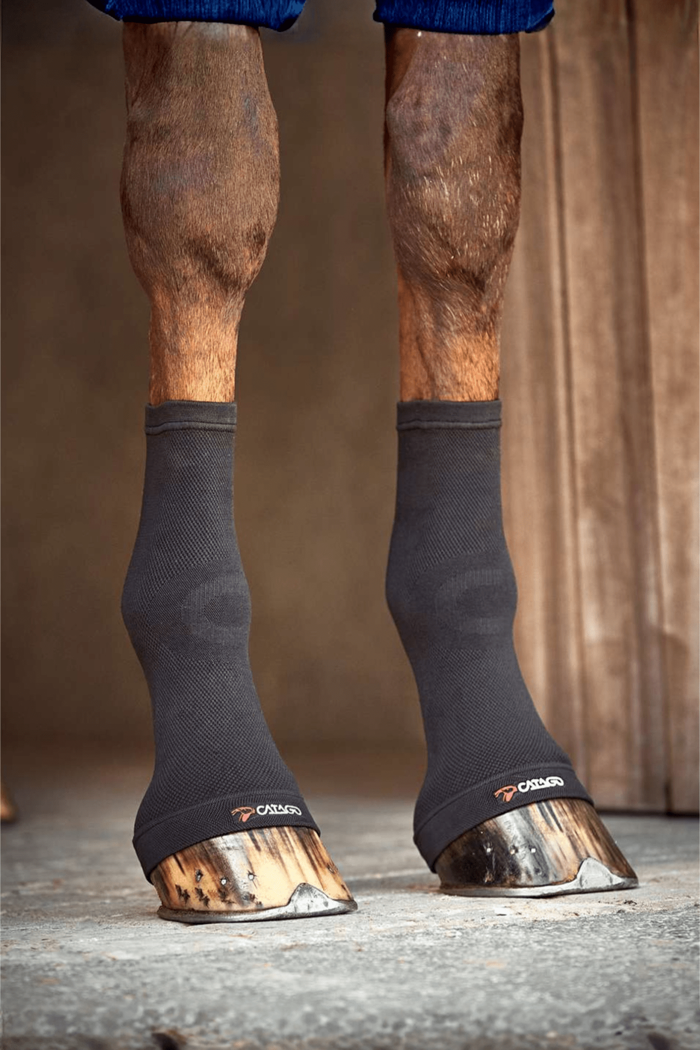 Kompressionssockar från Catago med Fir-Tech som reflekterar hästens kroppsvärme och bidrar till ökad cirkulation och expanderar blodkärlen. CatagoFir-Tech socks håller senor och ligament smidiga och återhämtningsperiod kan minskas. Lämpliga till hästar som tenderar att få svullna ben vid transport eller i boxen under natten. Kan användas separat eller i kombination med benlindor eller skydd. Säljes i 2-pack.