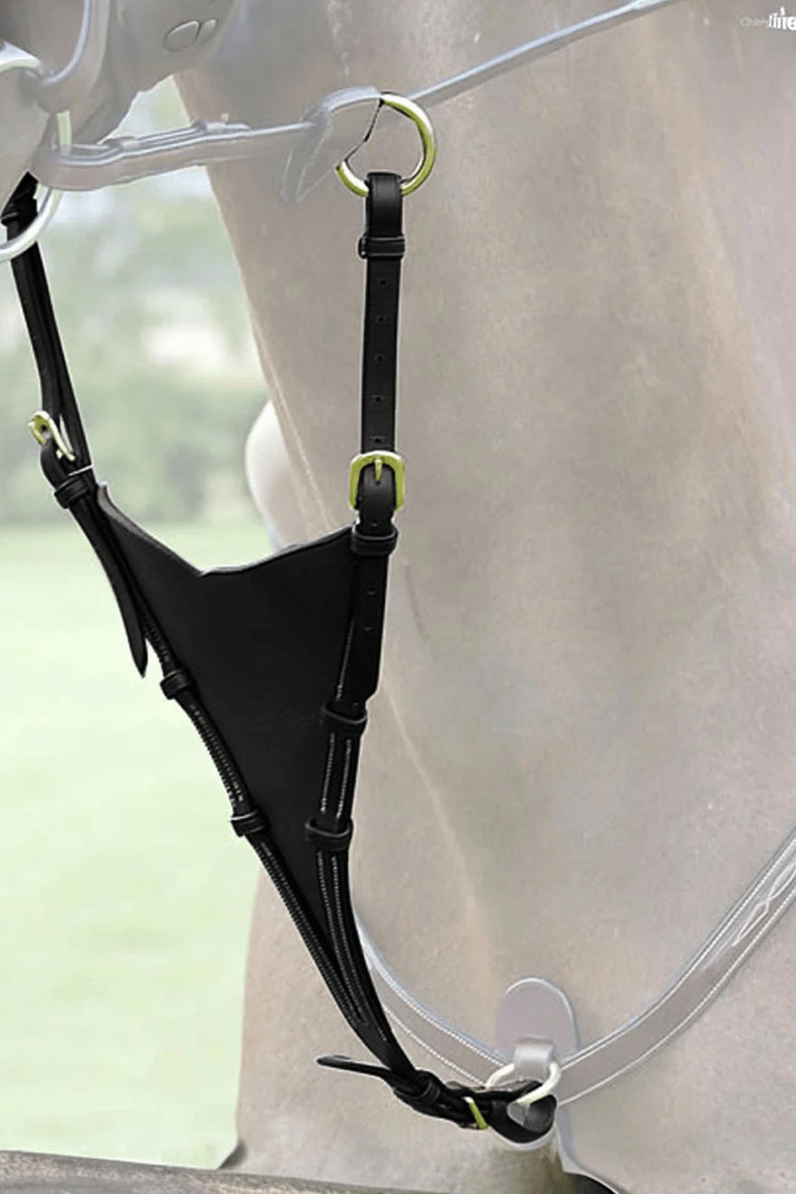 Kort martingal antibit i fint engelskt läder med cremefärgad mönstersöm. Försvårar för hästen att bita tag i och fastna i martingalen. Använd tillsammans med Dyón's bricole.