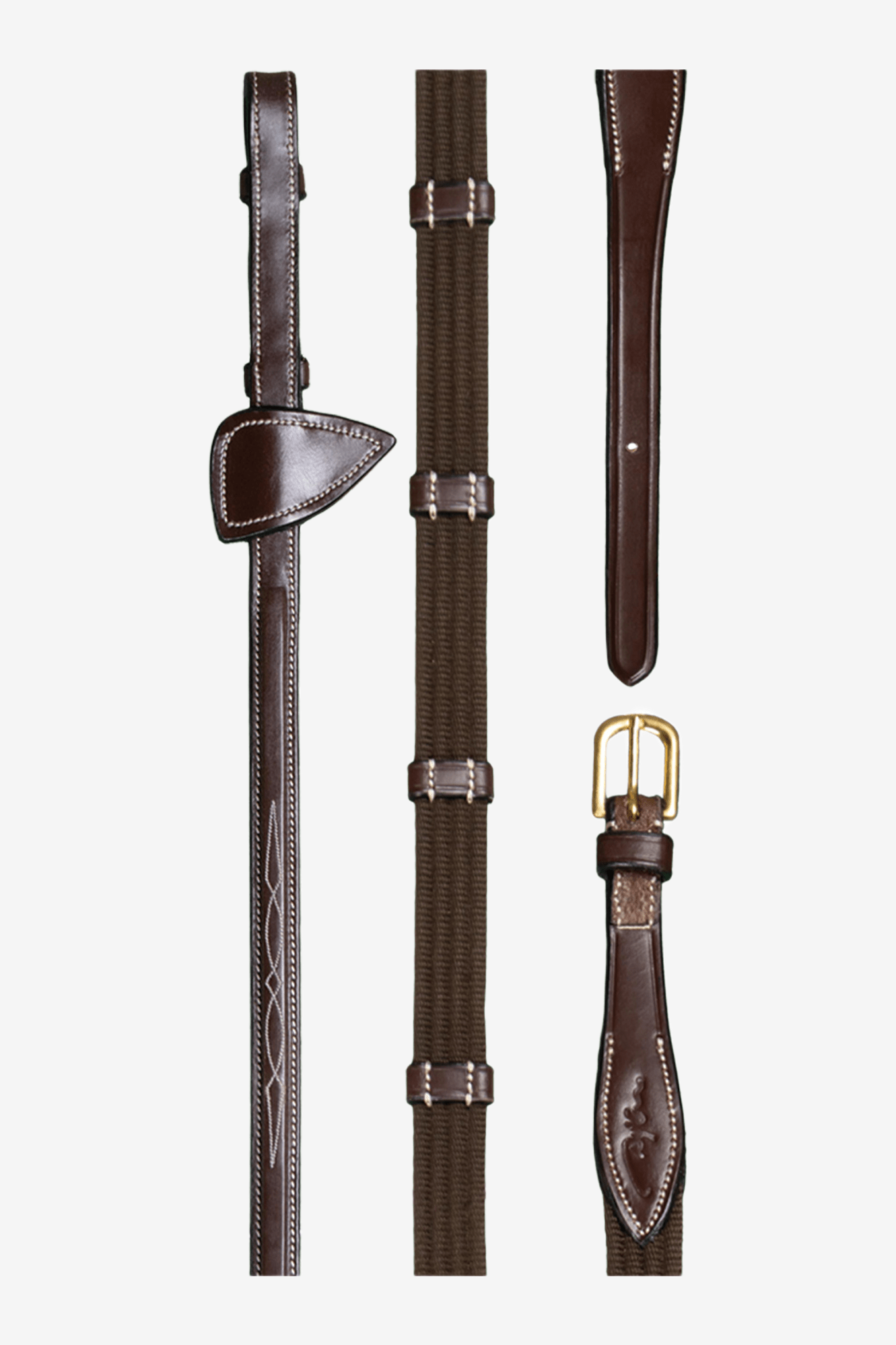 Vävribbstygel 16mm med stoppar från Dyón Collection. Vävribbstygel med inåtvänt spänne vid bettet. Fint spanskt läder med vita sömmar och mässingsspänne.