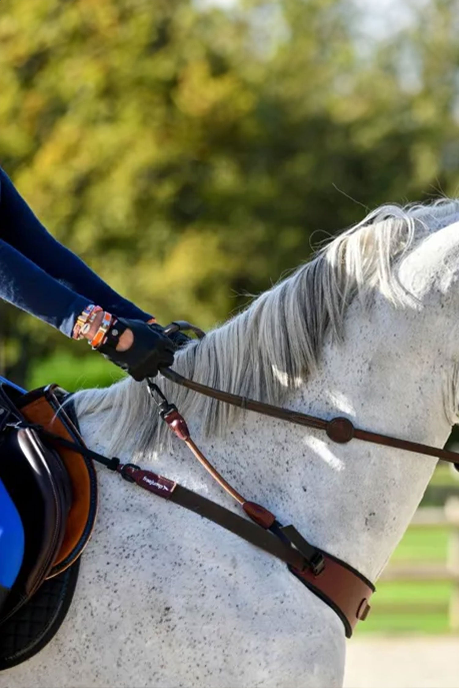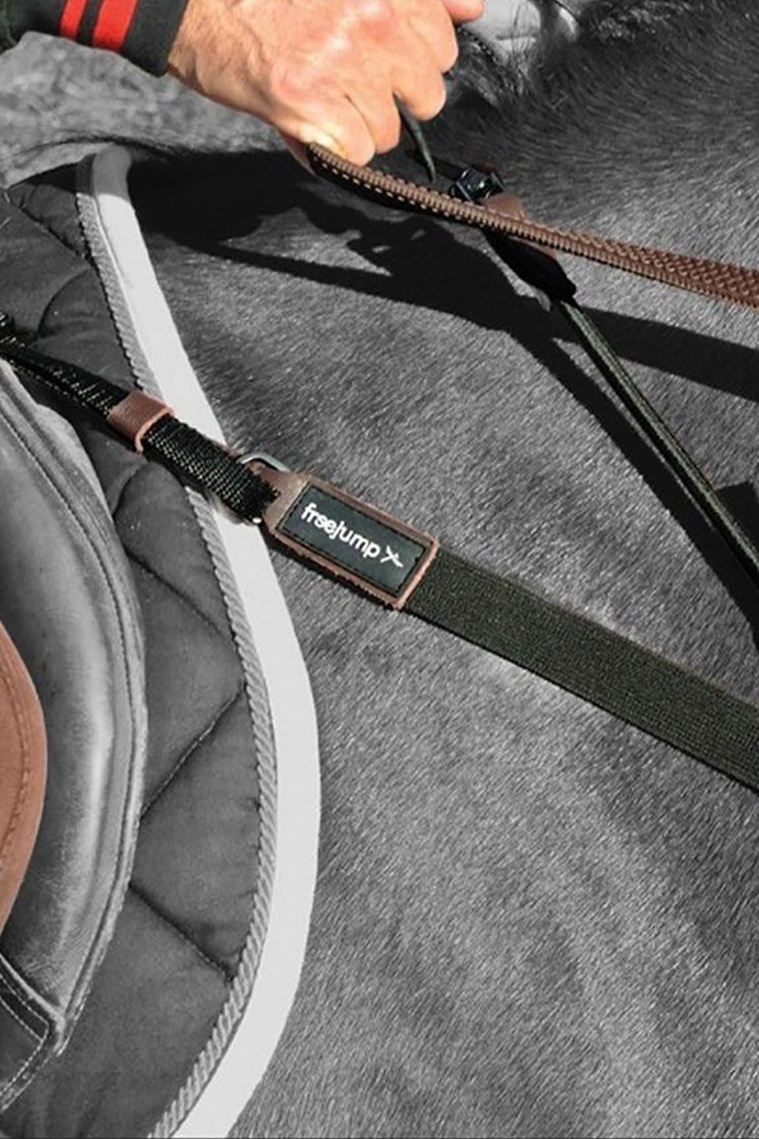 FREEJUMP® Kragen är fäst på sadelkrokarna och kan anpassas perfekt till halsen tack vare de två justeringsspännena. Justeringen av längden på det elastiska bandet beror på om ryttaren eller tränaren vill arbeta med en högre eller lägre hand.