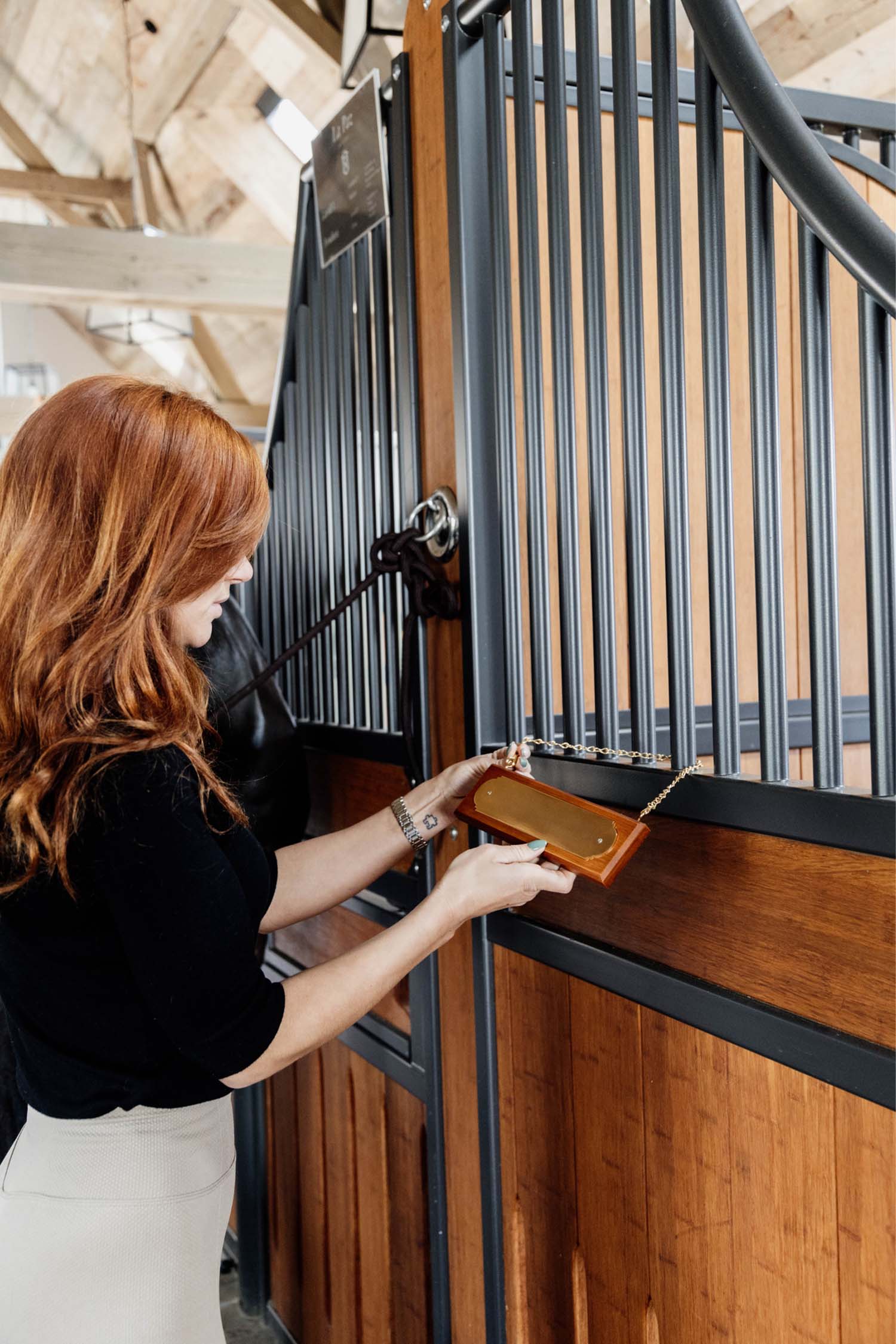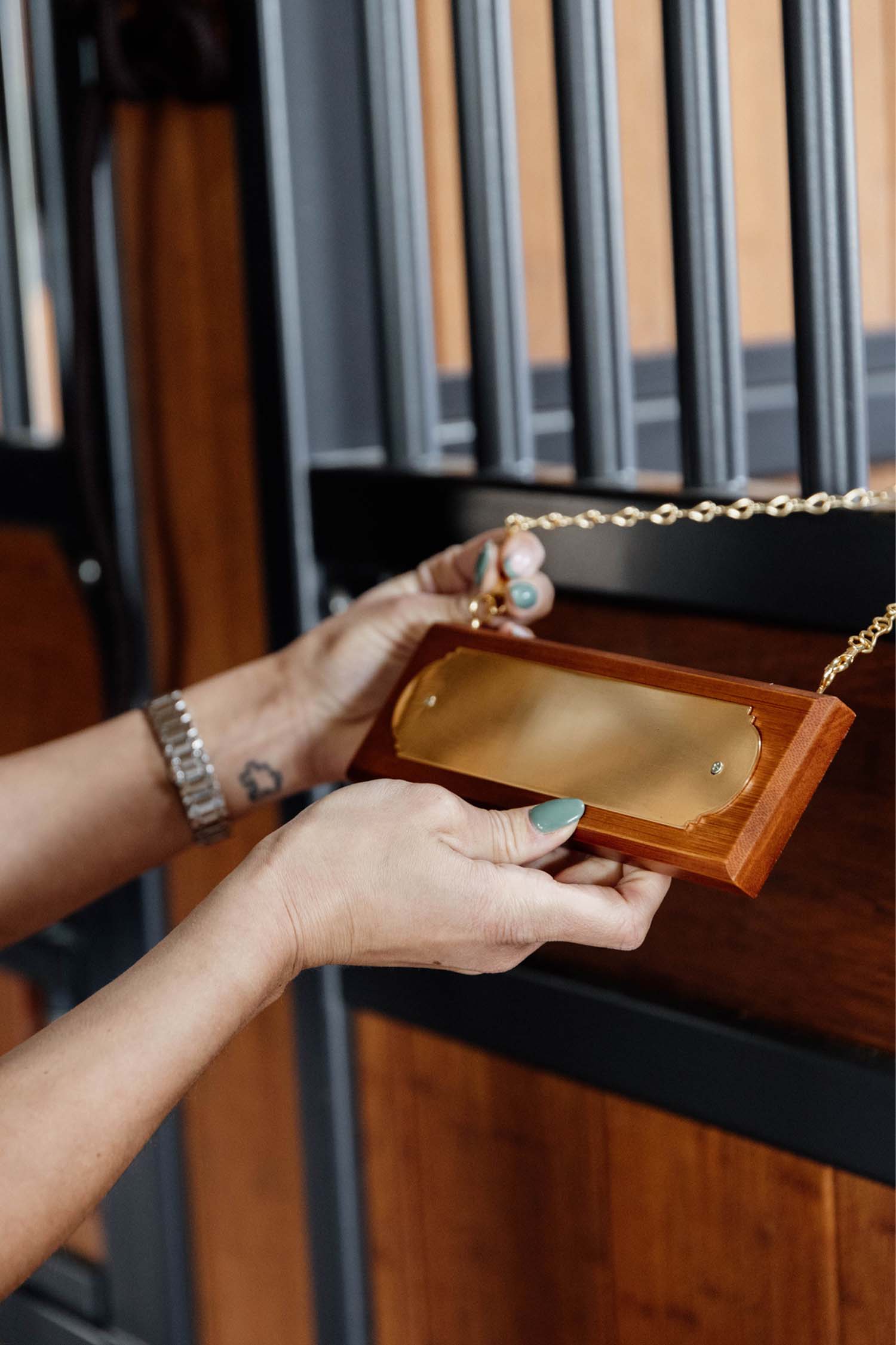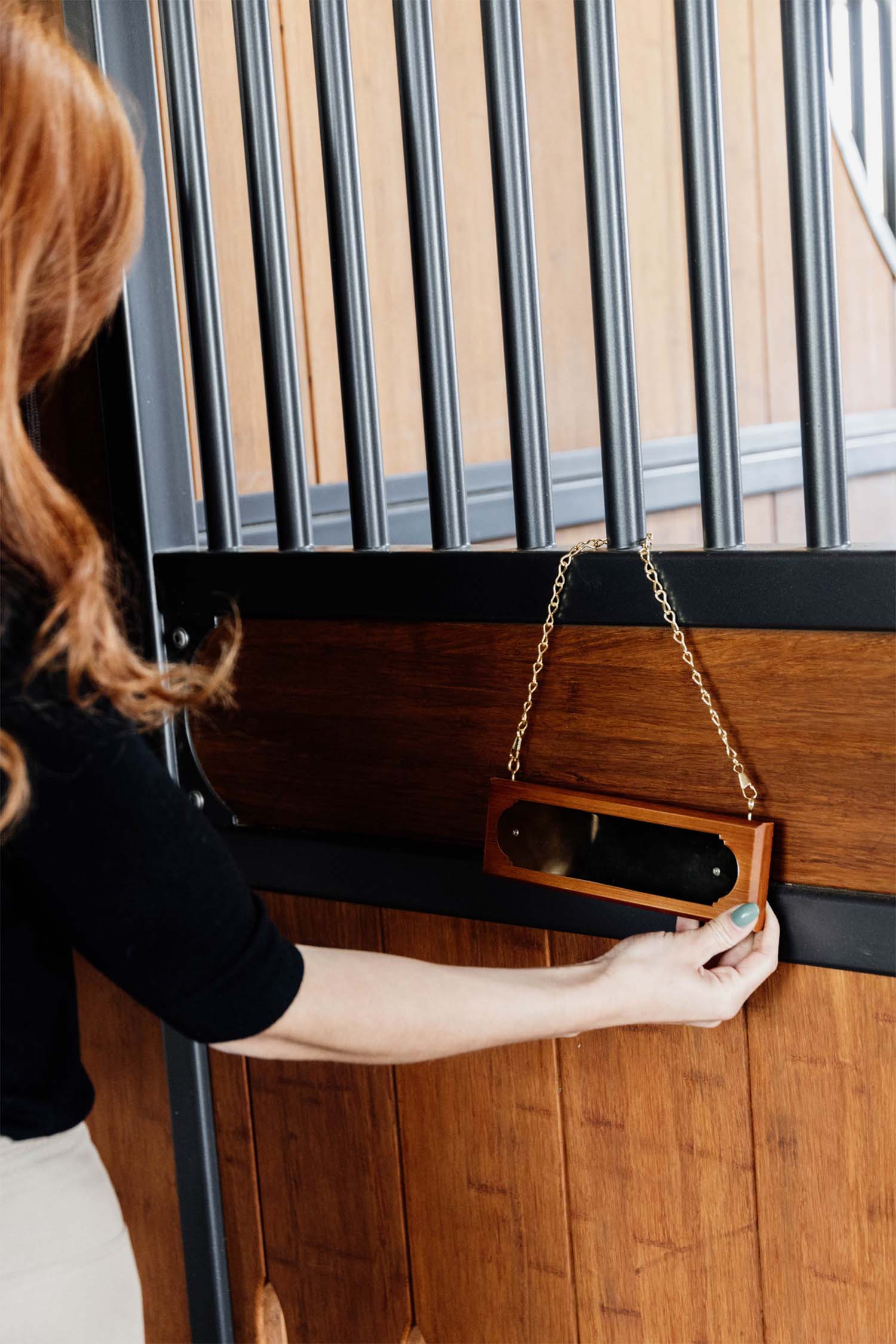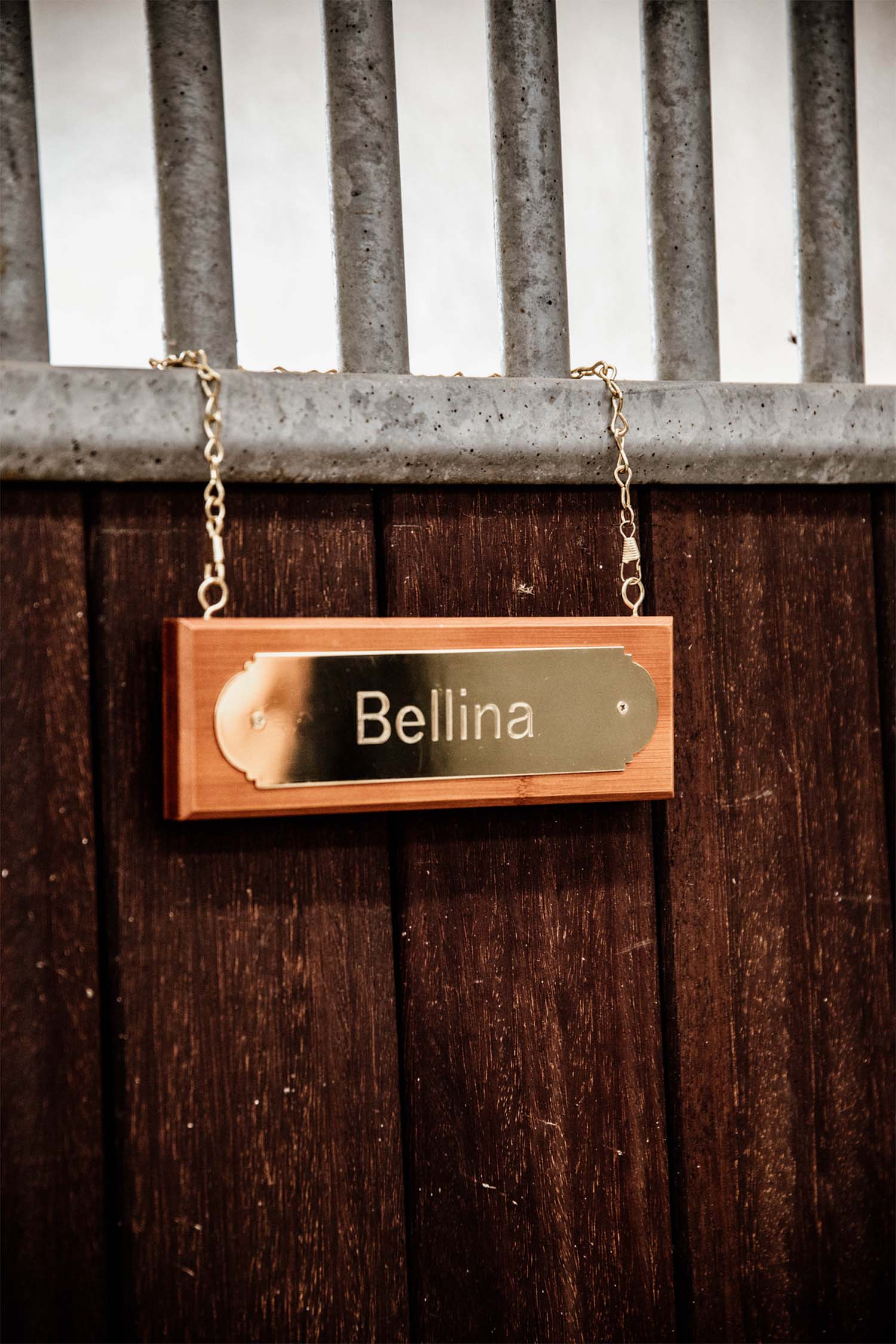 En snygg namnskylt som du kan ha på din hästs boxdörr som samtidigt ger en elegant stil i ditt stall. Enkel att anpassa då du lätt skruvar bort metallplattan för att gravera den.