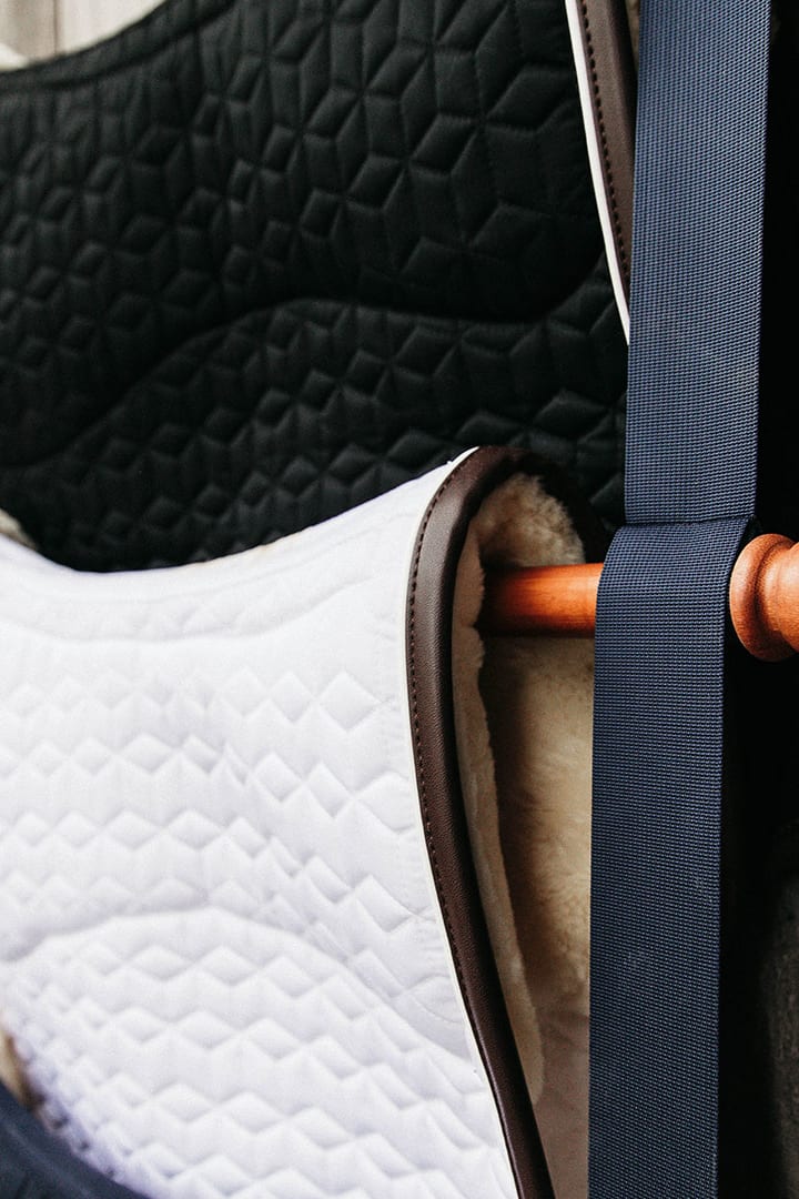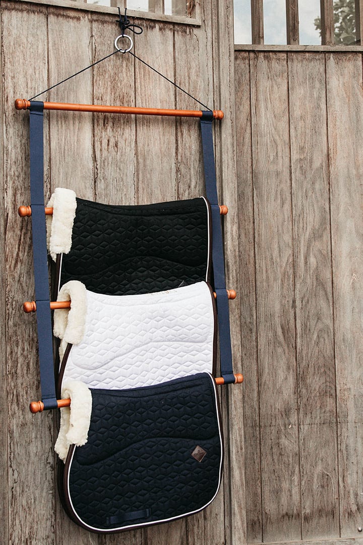 En täckes och schabrak hållare från Grooming Deluxe som elegant kombinerar både stil och effektivitet. Förvara dina schabrak i stallet, på tävlingsplatsen eller i sadelkammaren på ett smidigt och stiligt sätt.