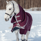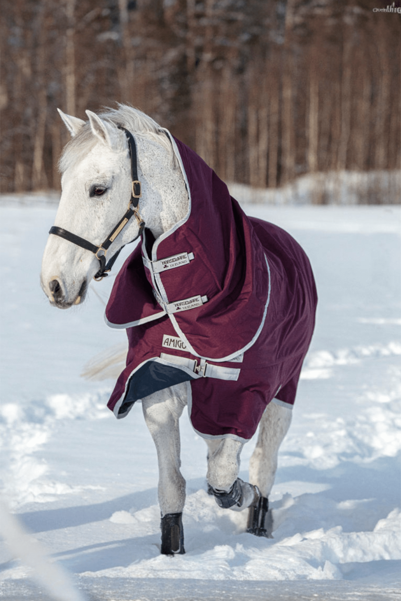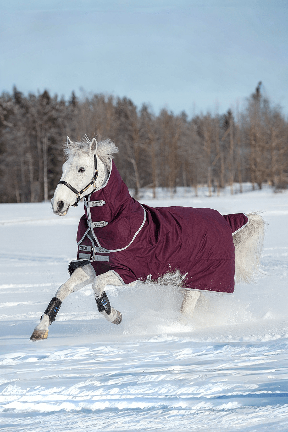 Dubbla T-spännen framtill med kardborre för extra säker knäppning. Uppskuren vid frambenen för en större rörelsefrihet. Kryssgjordar under magen. Metallöglor på insidan för att enkelt fästa den lösa halsen som medföljer med detta täcket.