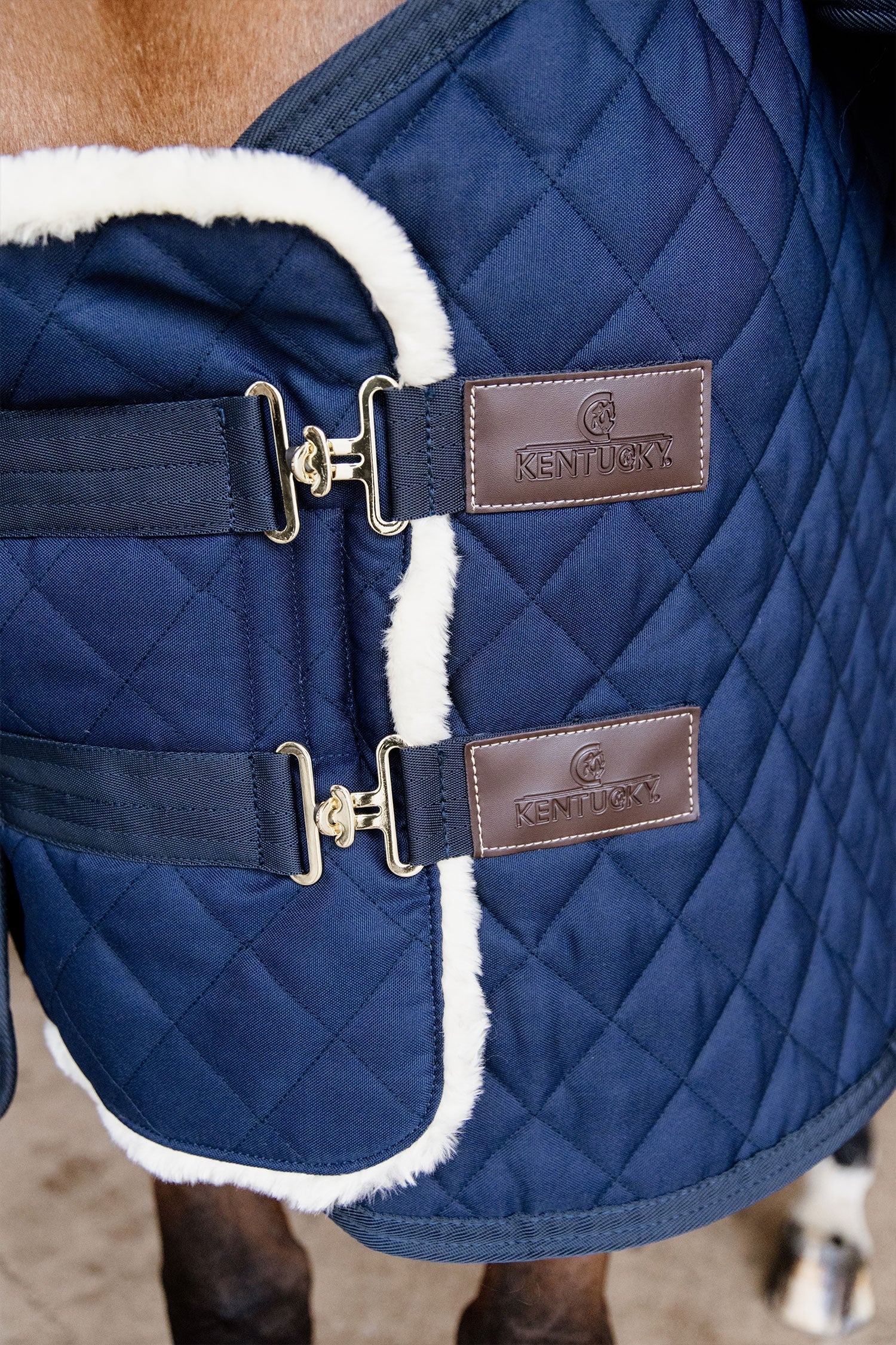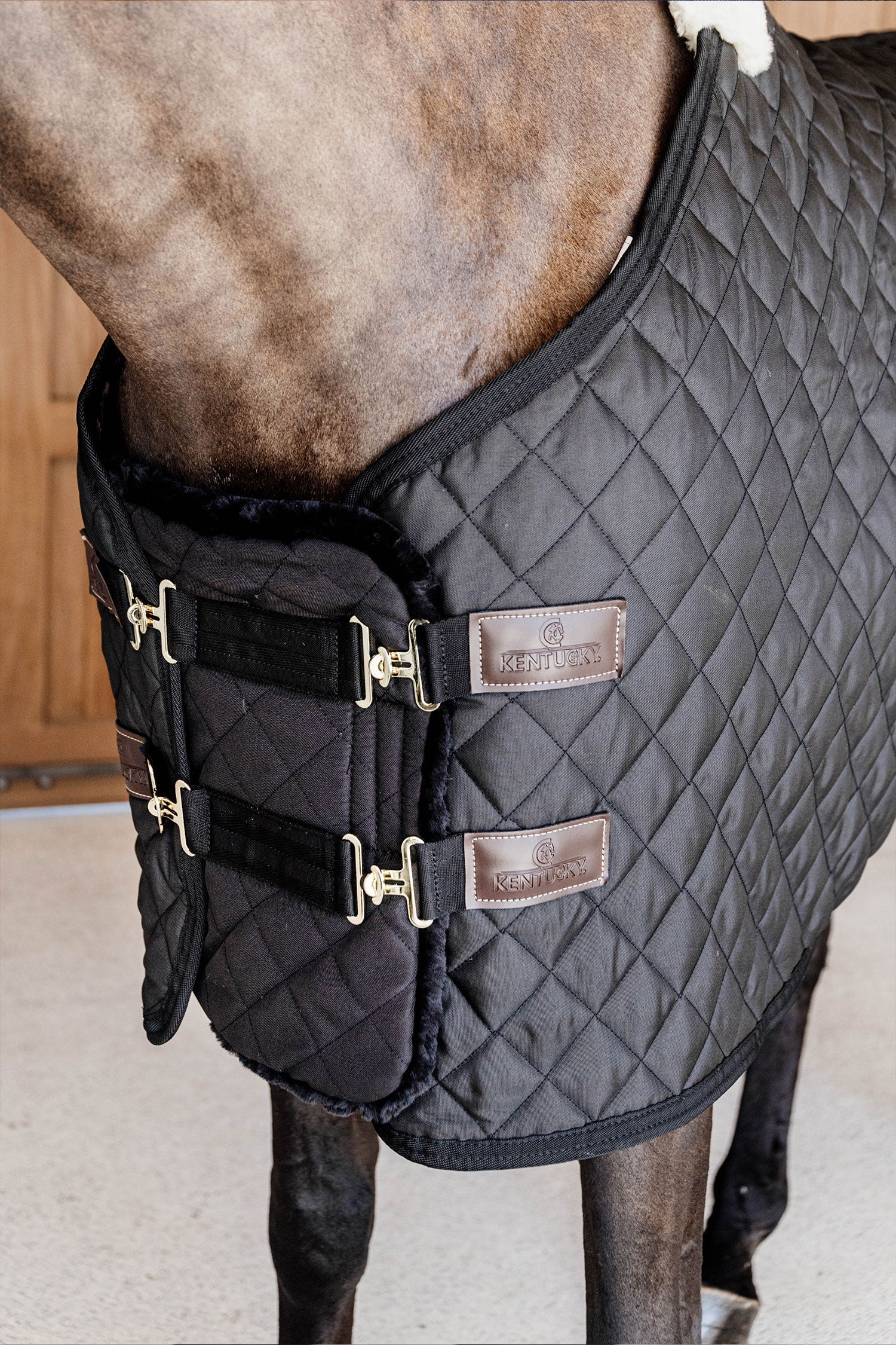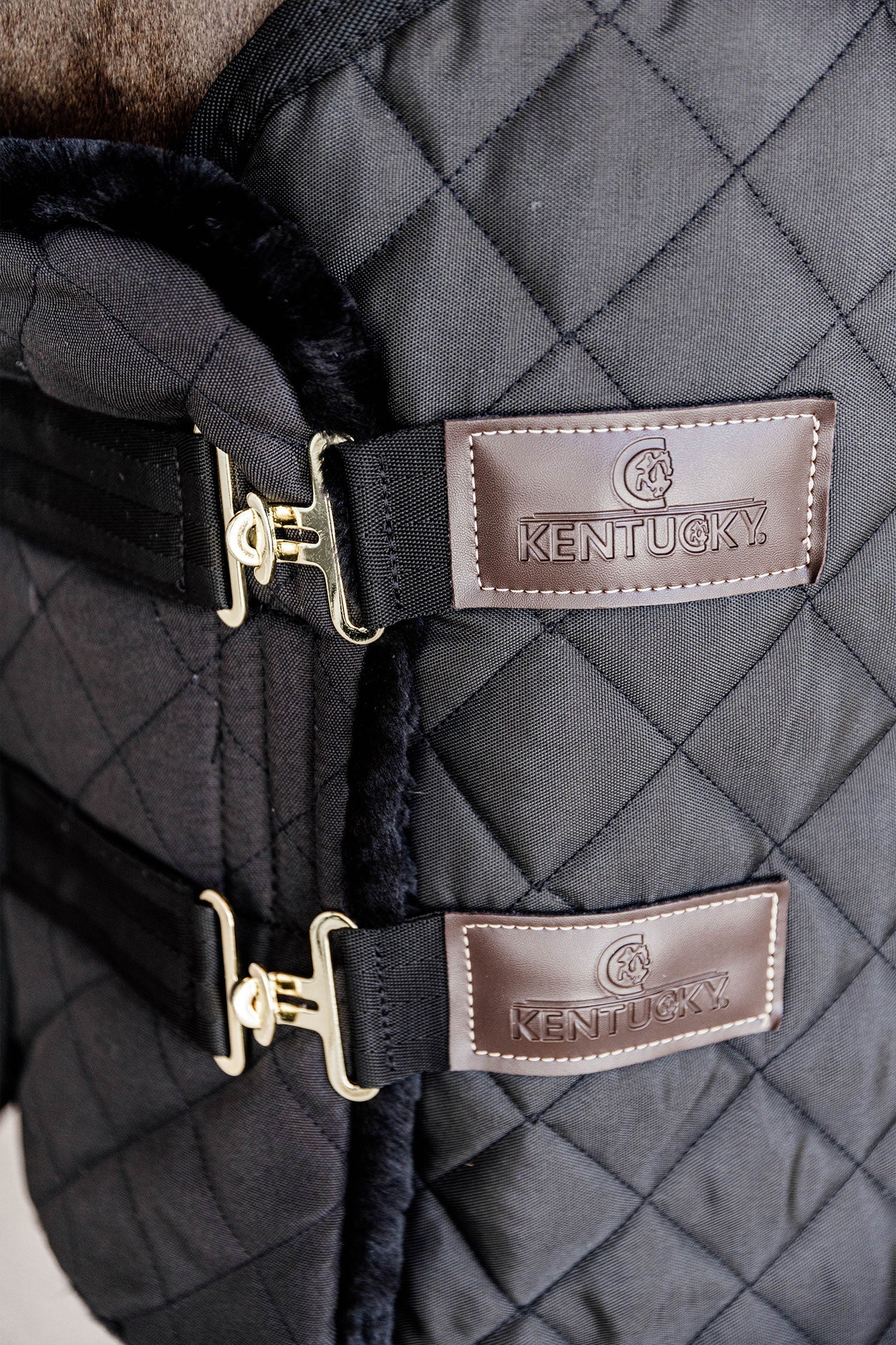 Utsidan är av 600d polyester och är snyggt quiltad vilket gör att den matchar utmärkt till Kentuckys stalltäcke. Yttertyget är rivtåligt och insidan är av Kentuckys välkända konstgjorda fårskinn vilket gör den otroligt mjuk.