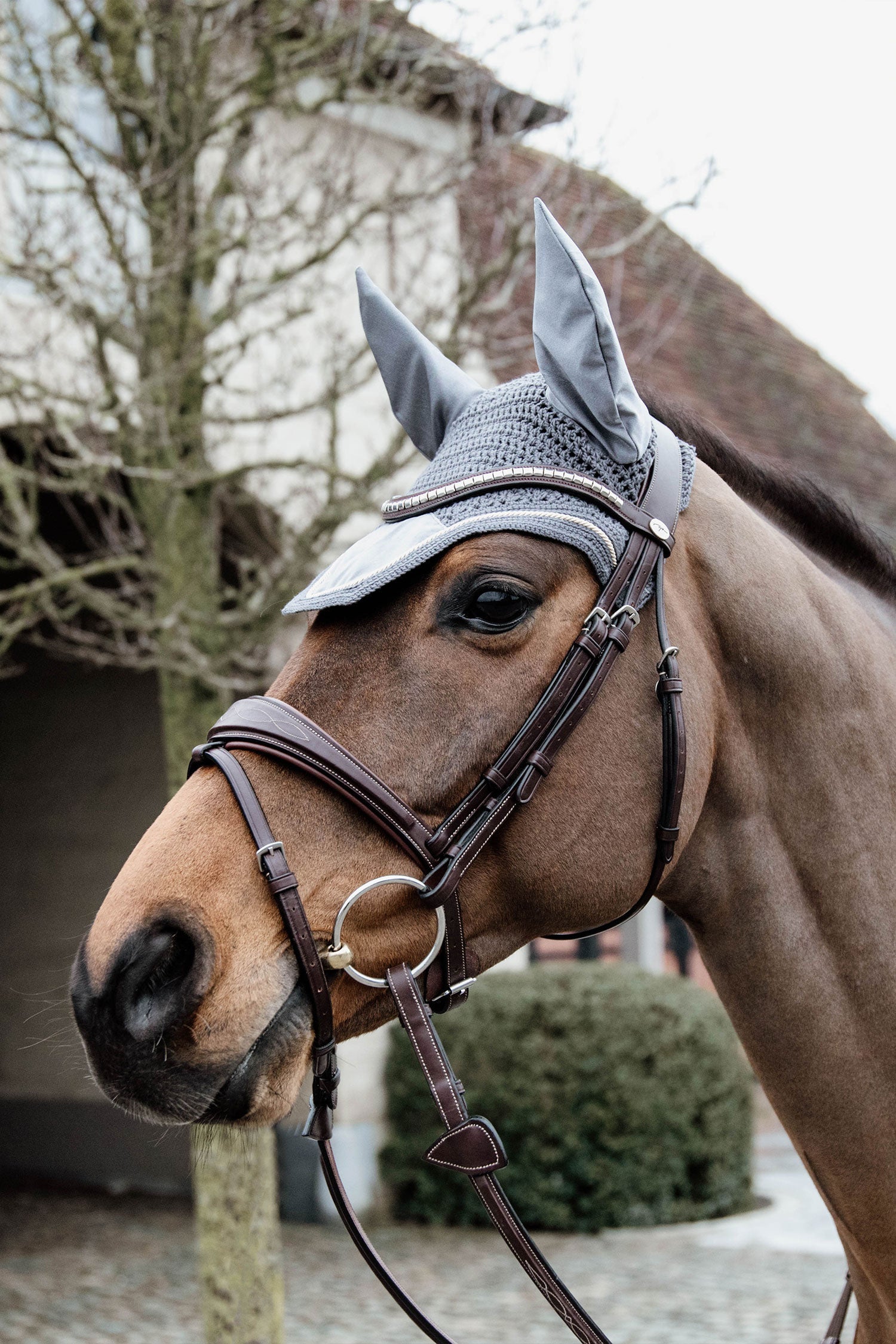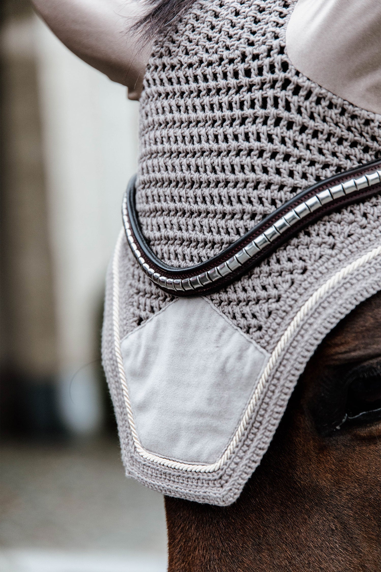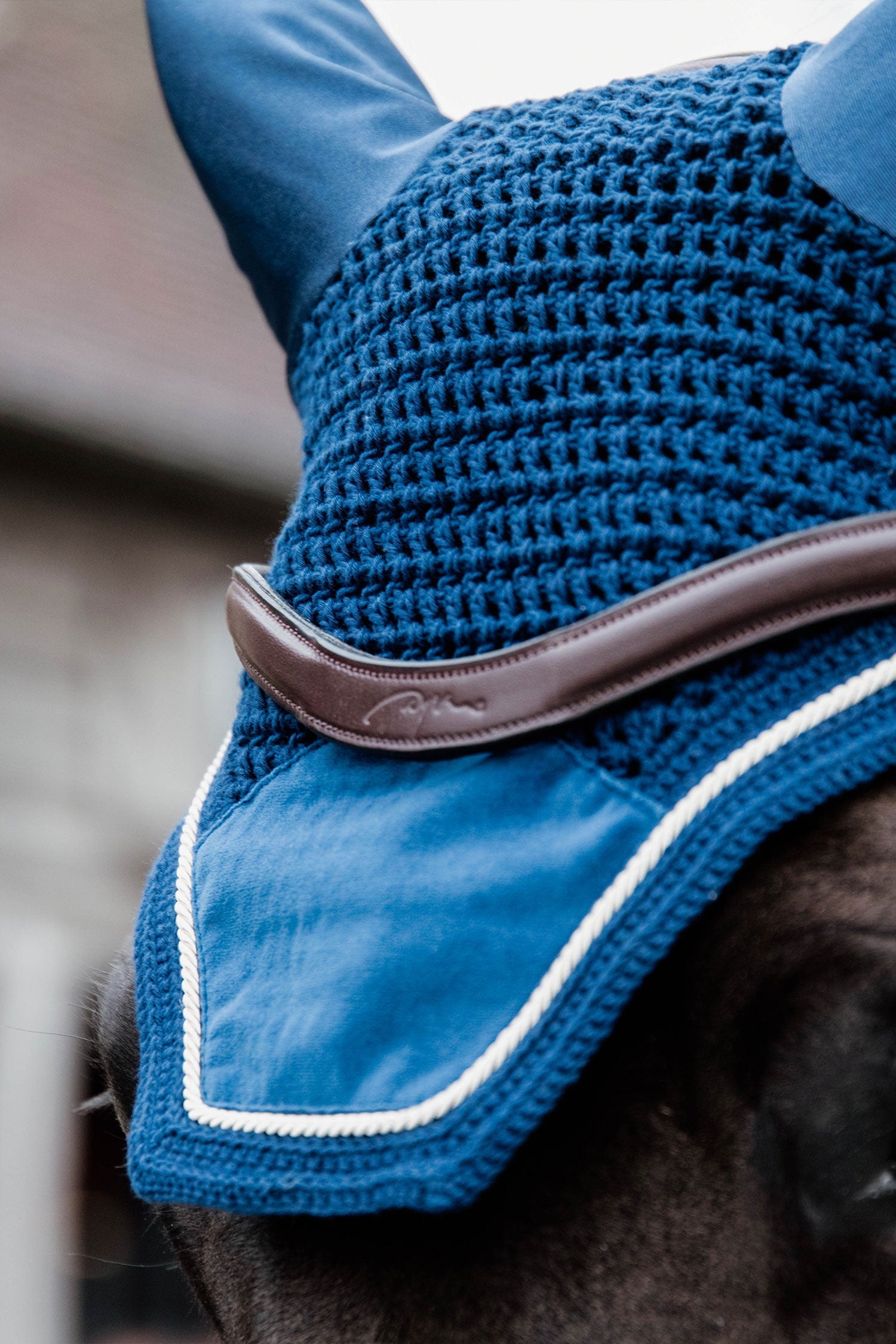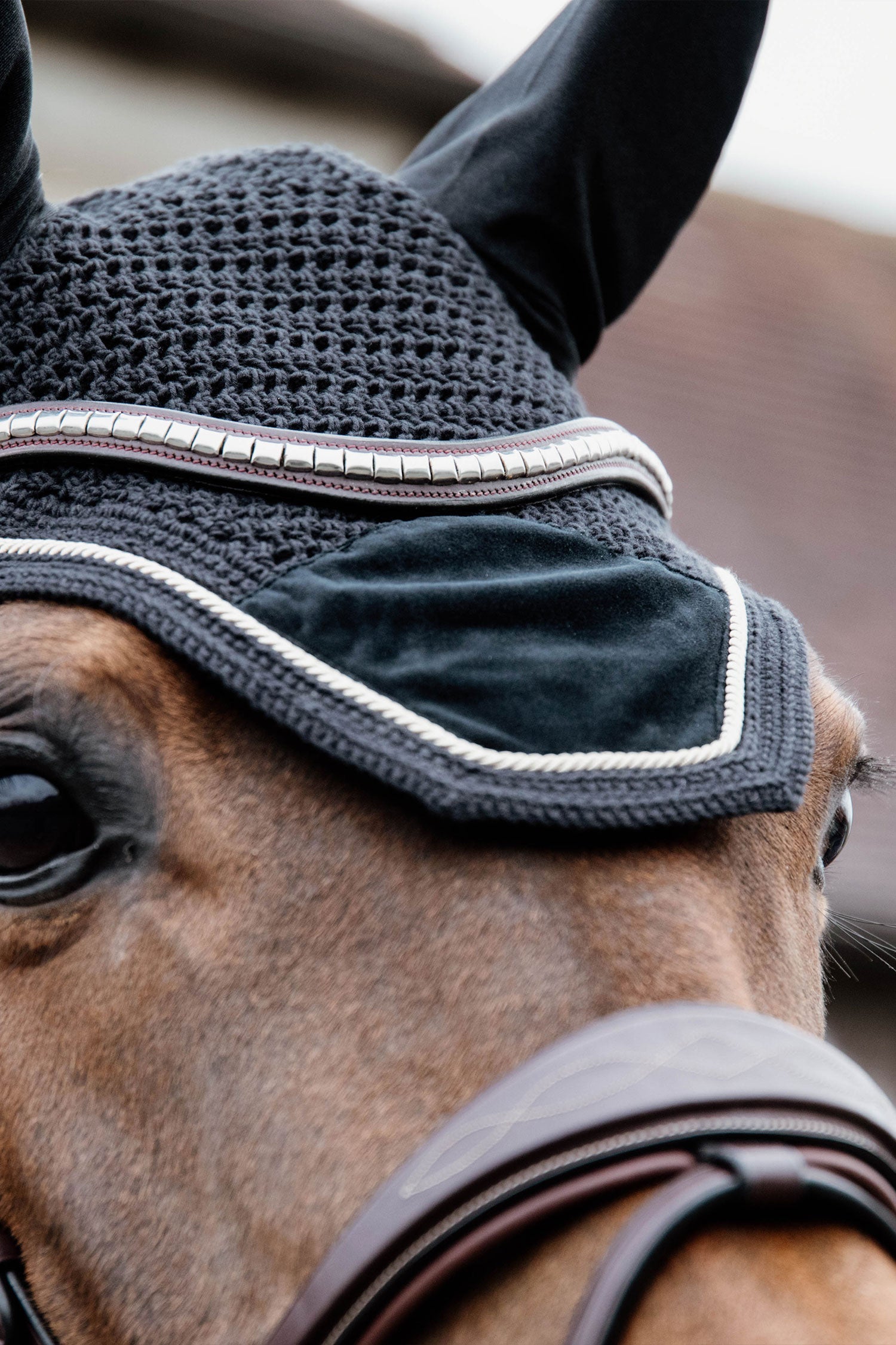 Huvan är med snygga sammetsdetaljer som matchar Velvet kollektionen från Kentucky. Fly Veil Basic Velvet skyddar hästens öron mot flugor under ridning och är en snygg detalj. Materialet runt öronen är i stretch och slimmad passform vilket ger en skön passform.