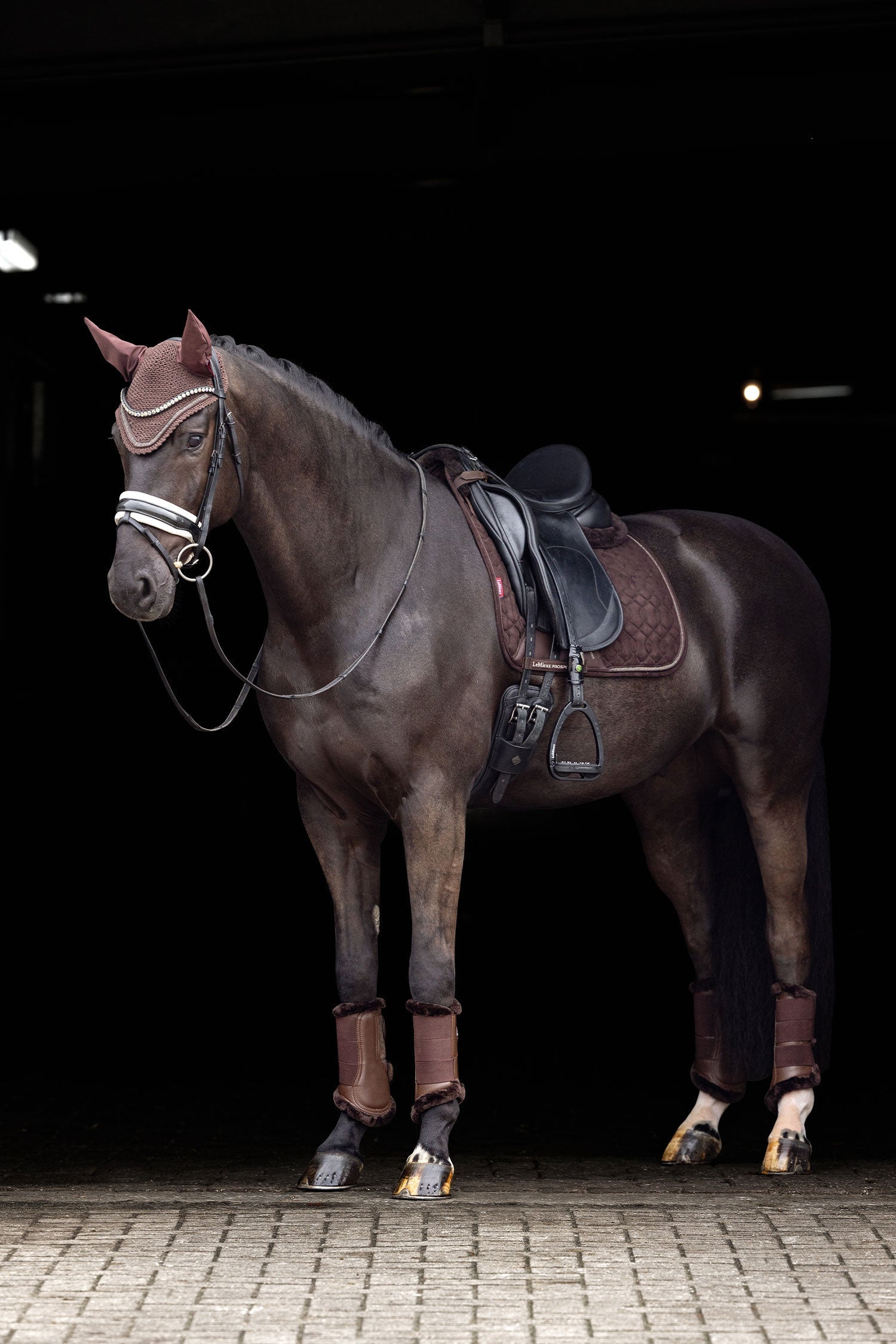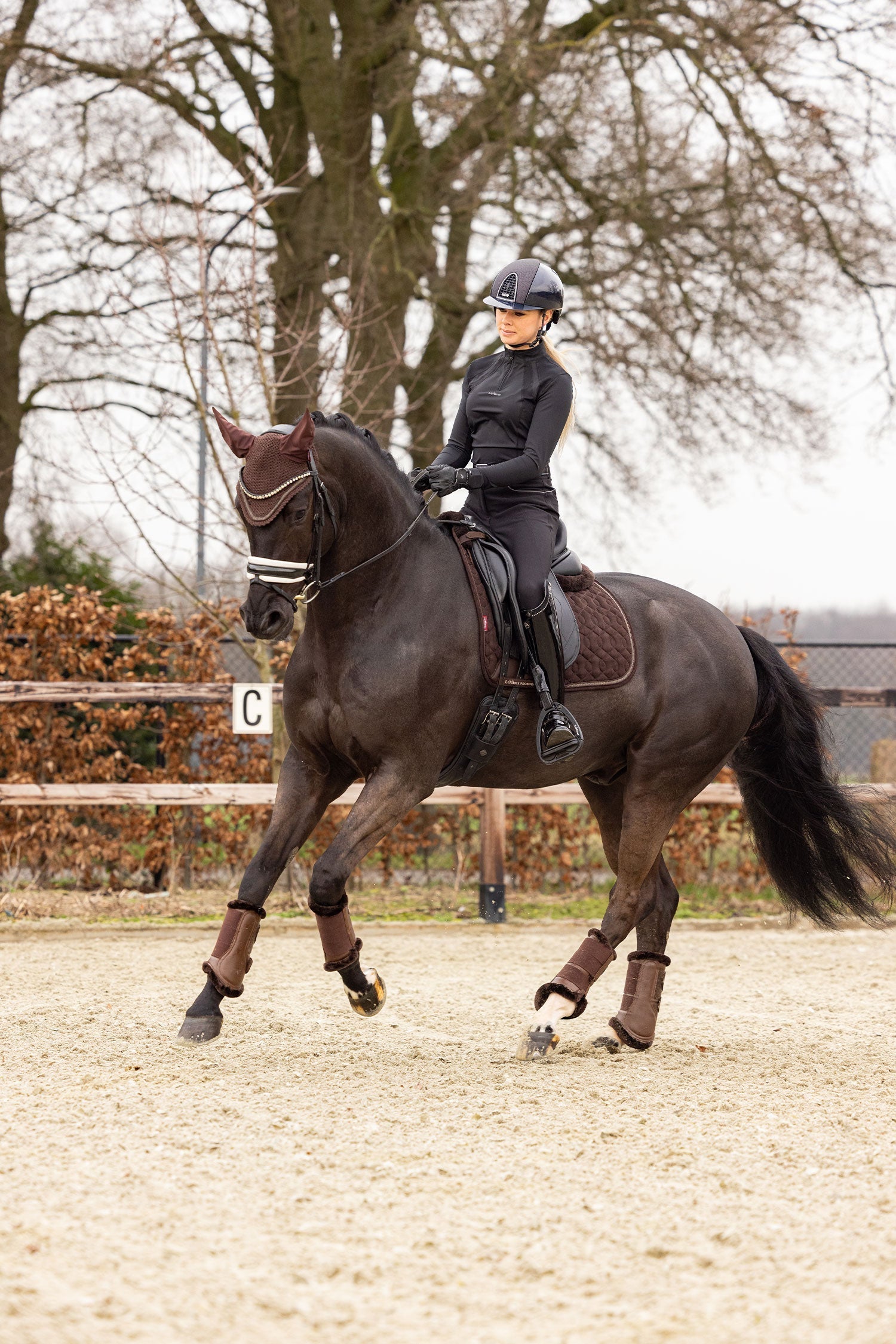 Ett riktigt härligt schabrak för den medvetna ryttaren. Med en mjuk och skön mocka yta och en glitterrad får schabraket ett exklusivt utseende.