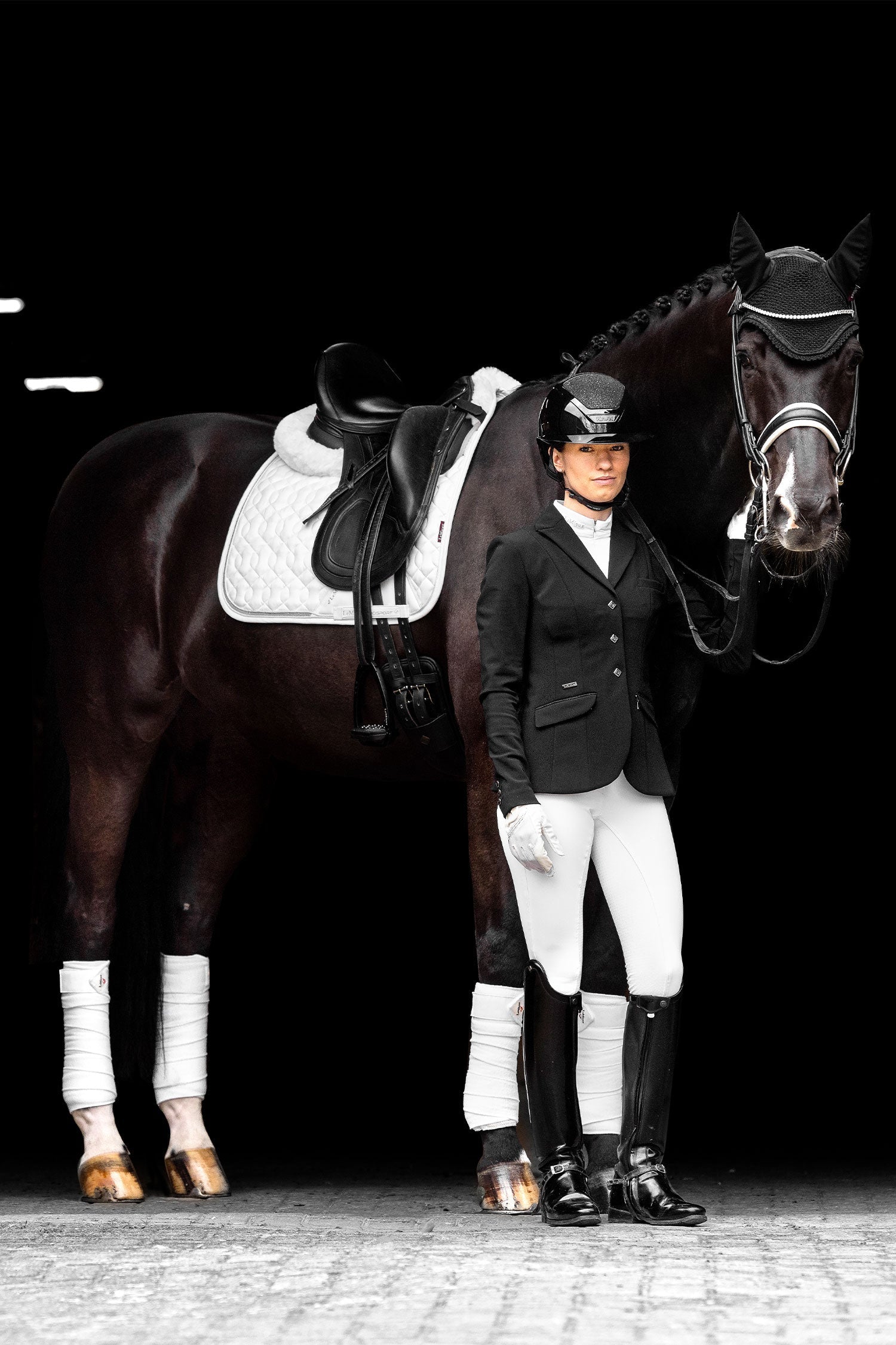 Runt sadelgjorden sitter det ett PU material för att undvika skav mot tyget. Dressage schabraken är skurna för att passa ett brett utbud av marknadens olika dressyrsadlar.