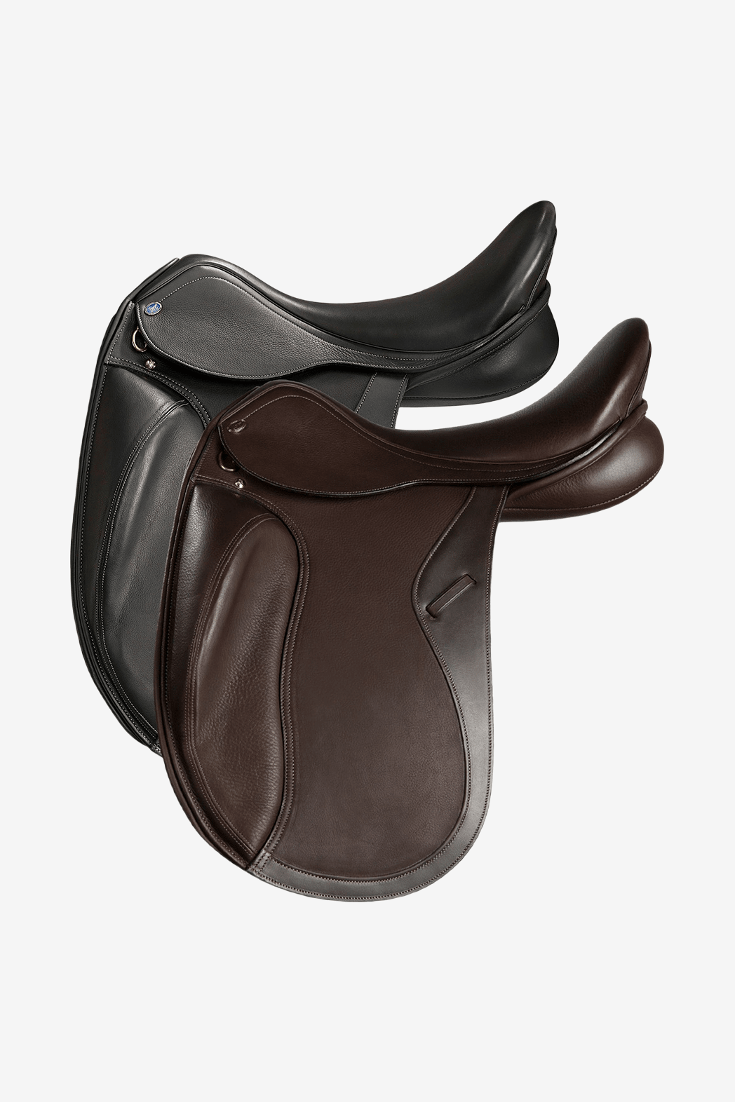 I fint skin, med smal midja som ger en närhet till hästen och övergår i ett öppnare säte med större sittyta för ryttaren.