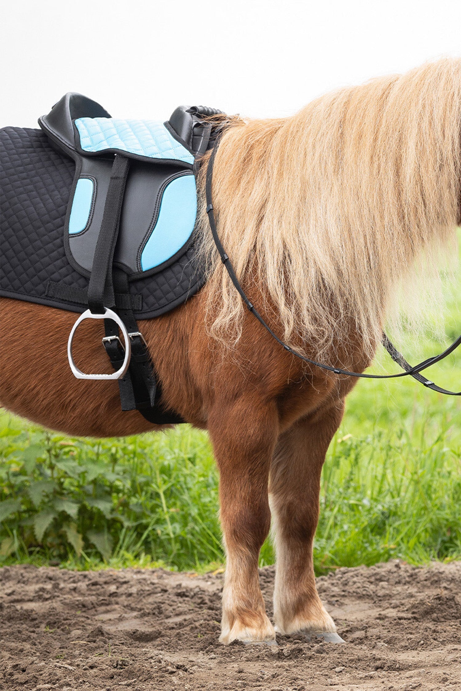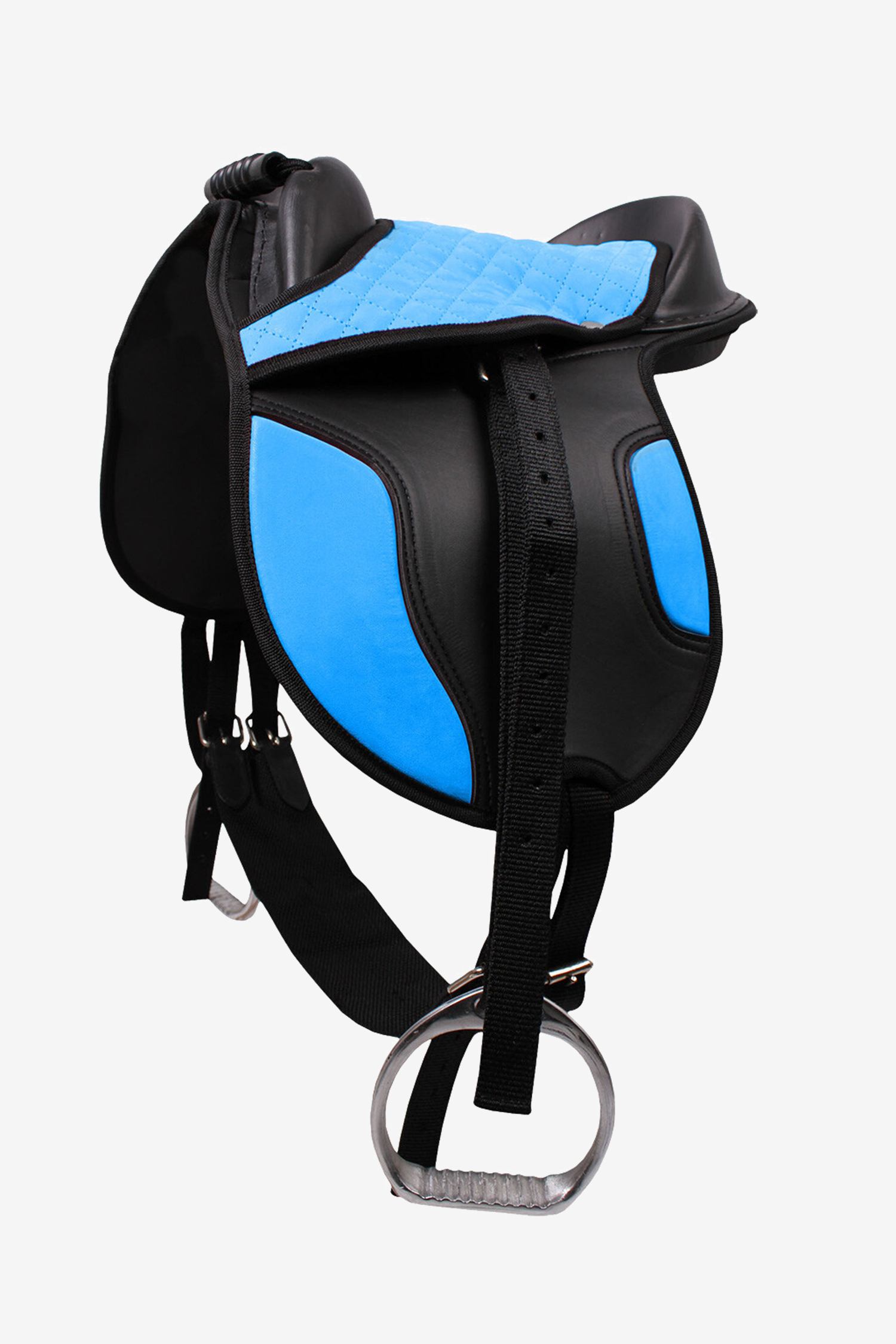 En härlig barnsadel fullt utrastad med sadelgjord, stigläder och stigbyglar. Perfekt för den mindre ryttaren. Handtag på framsidan för att kunna ta ett stabilt grepp.