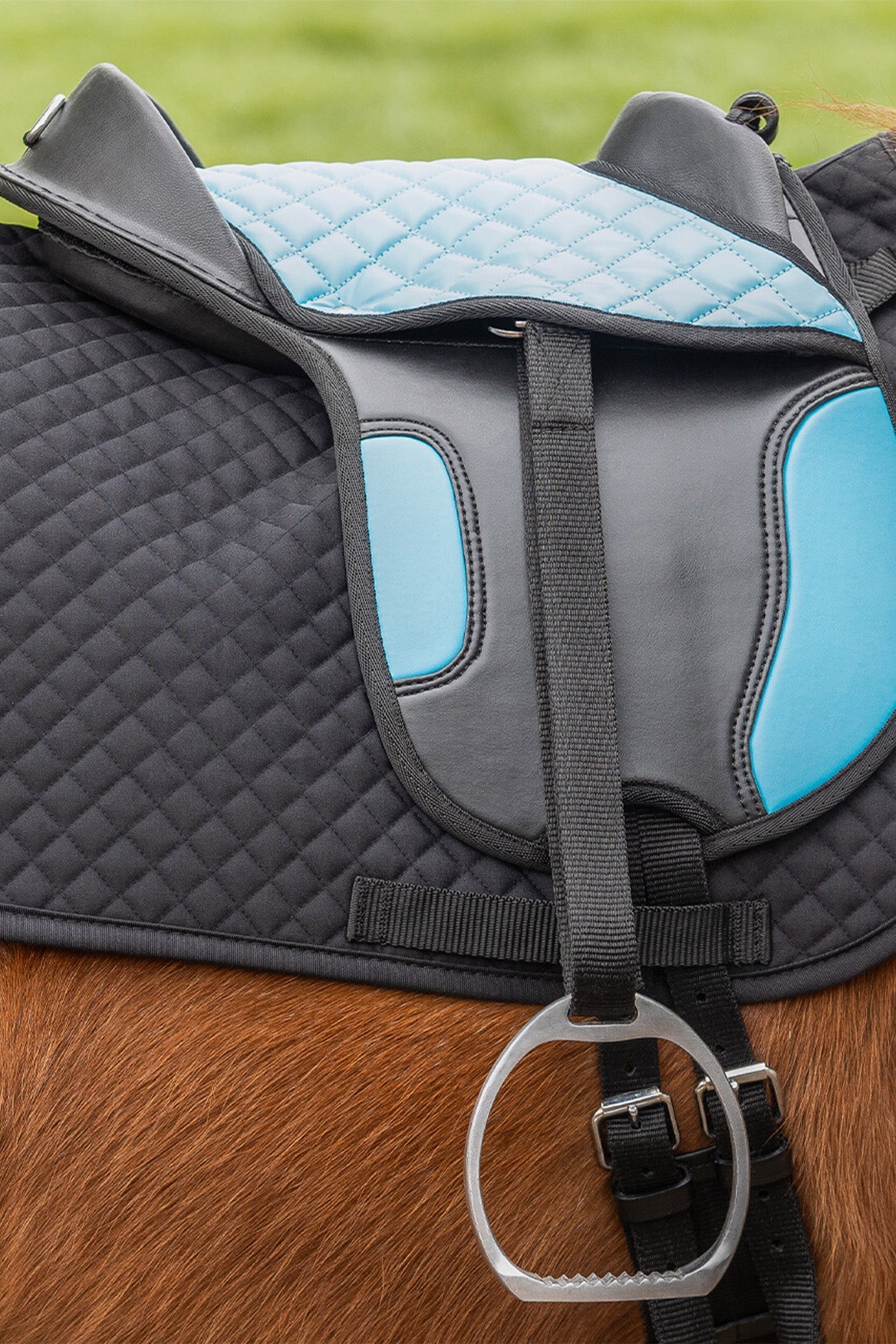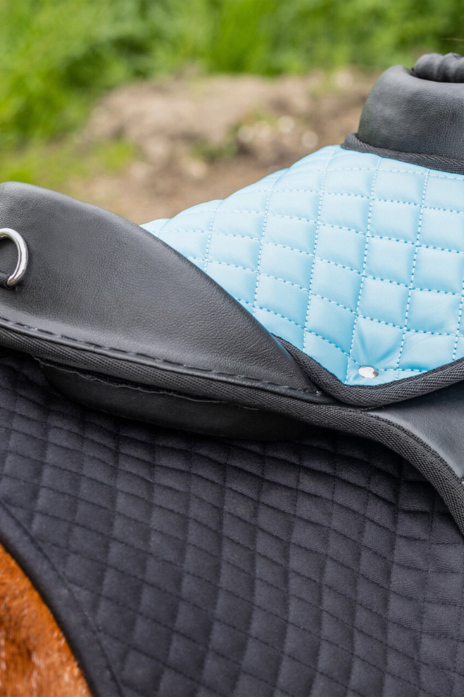 Ring på baksidan för eventuellt fästa svanskappa. Sadeln är även utrustad med paneler som kan justeras med kardborreband.