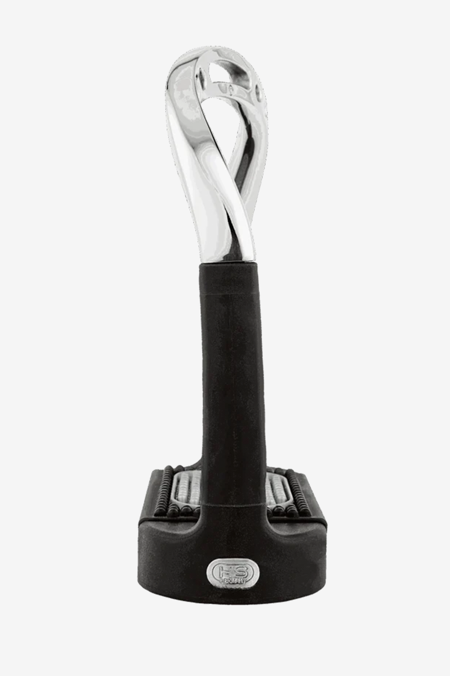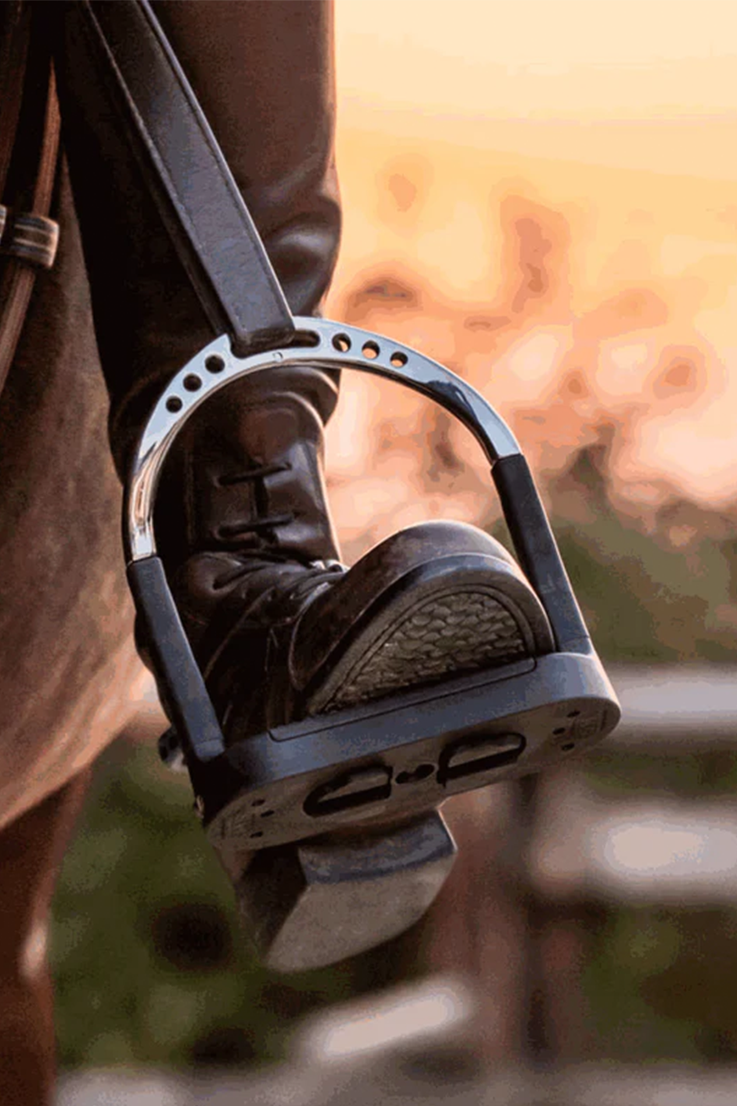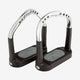 Den moderna designen i fint silver/svart kompletterar de funktionella egenskaperna hos stigbygeln. Den är tillverkad i högkvalitativt rostfritt stål och är delvis täckt med plast eller slitstarkt gummi. För att fästa stigbygeln korrekt på sadeln, är den markerad i den övre delen med ett "L" för vänster och ett "R" för höger.